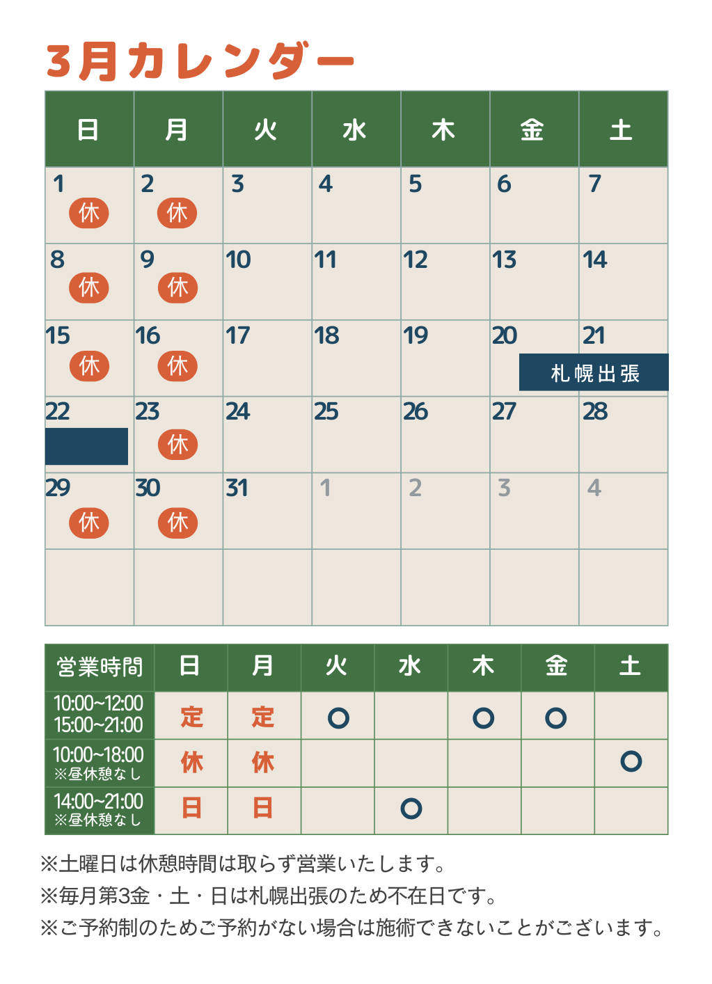 ※ 第3金・土・日曜日は札幌出張の為、不在日とさせて頂きます。