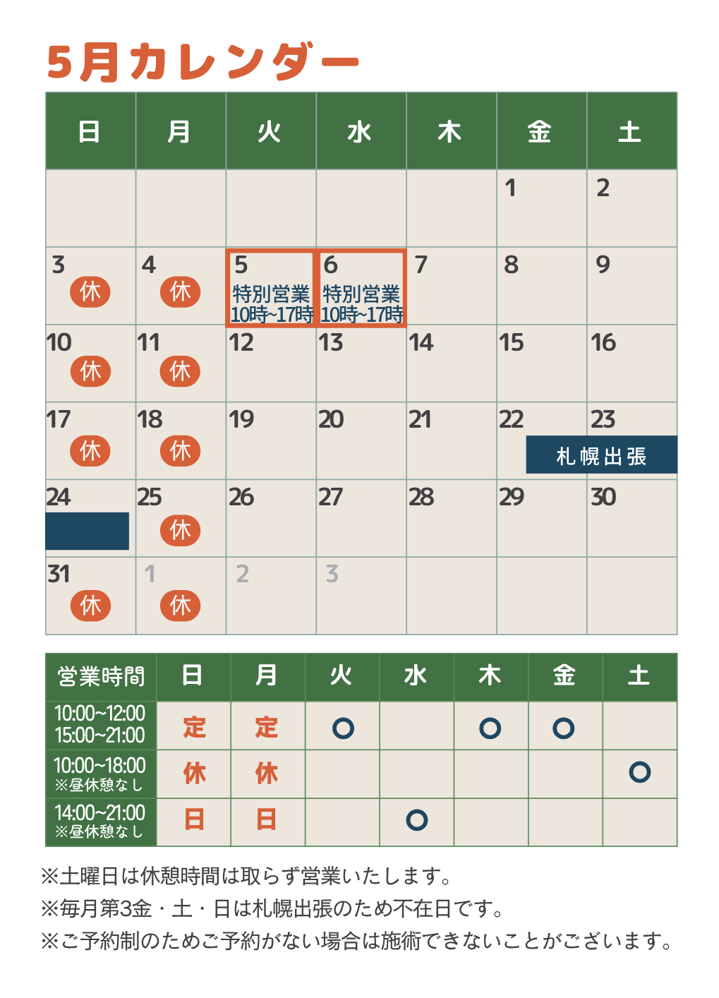 ※ 第3金・土・日曜日は札幌出張の為、不在日とさせて頂きます。